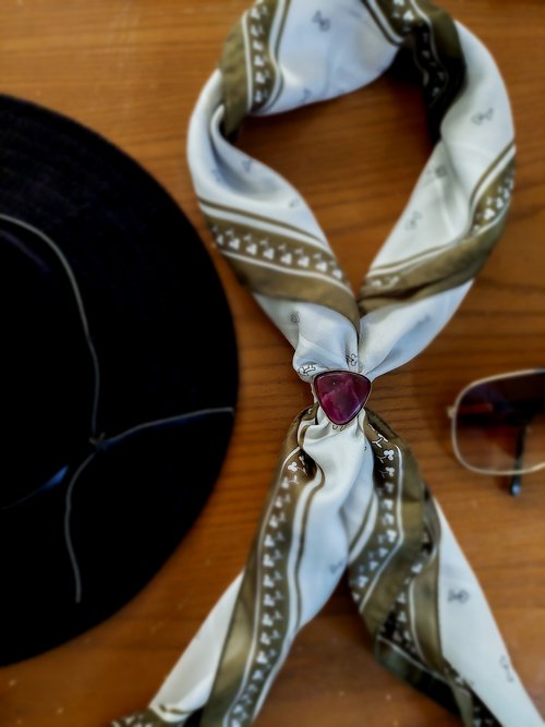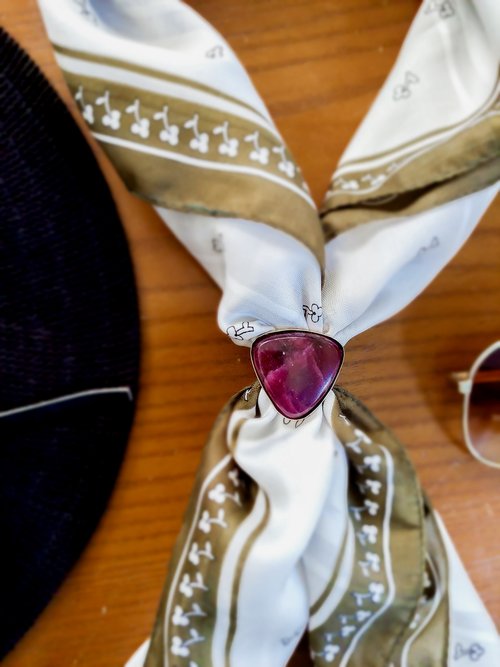 Sterling silver slide featuring a remarkable Lepidolite crystal. This slide can be worn on a cotton bandana or a thick silk scarf.