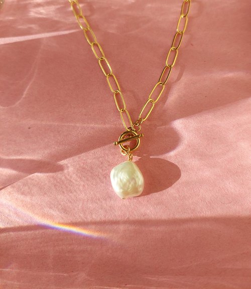 Elongated gold chain links with toggle closure, featuring an organic baroque pearl. Each pearl is unique in shape and size, and is one of a kind.