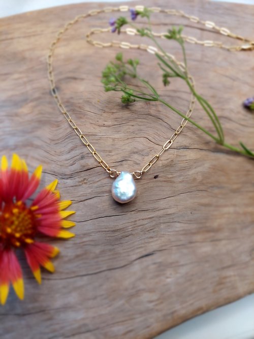 Elongated gold chain links, featuring an organic baroque pearl. Each pearl is unique in shape and size, and is one of a kind.